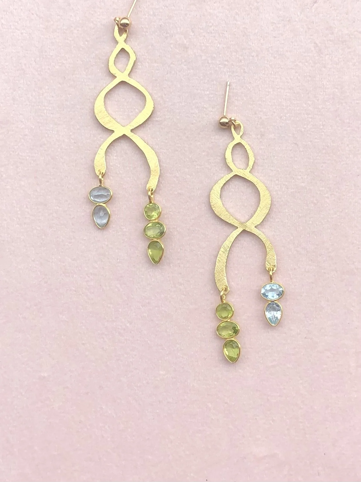 Boucles d’oreilles entrelacées, découpées à la main et plaqué or. Ponctuées de belles topazes et de péridots, finement taillées.