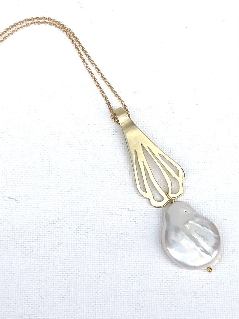 Découvrez cette belle perle baroque sur son pendentif découpé à la main et plaqué or. La chaîne mésure 42cm et dispose d’une chaîne de réglage de 5 cm, plaqué or.