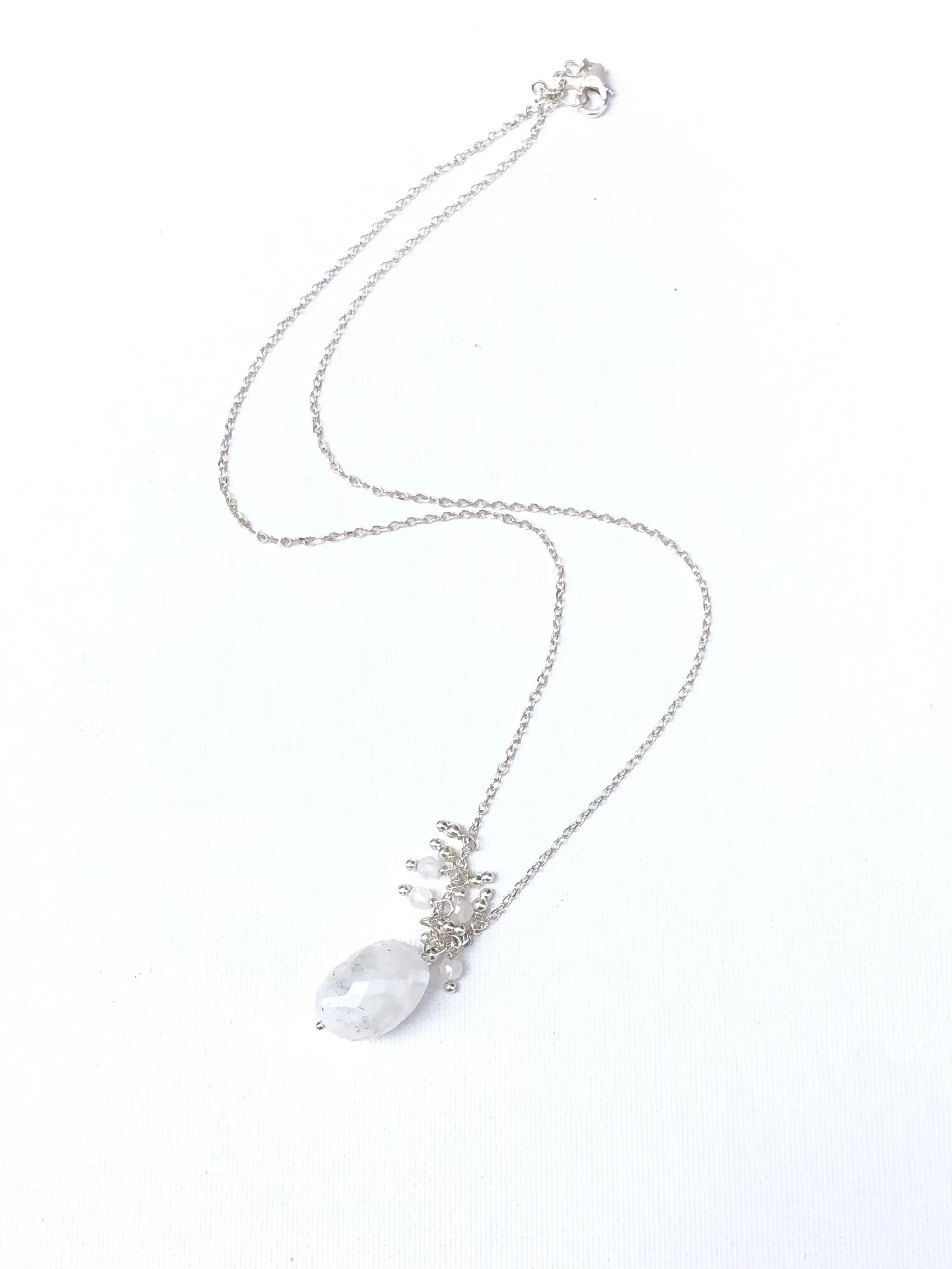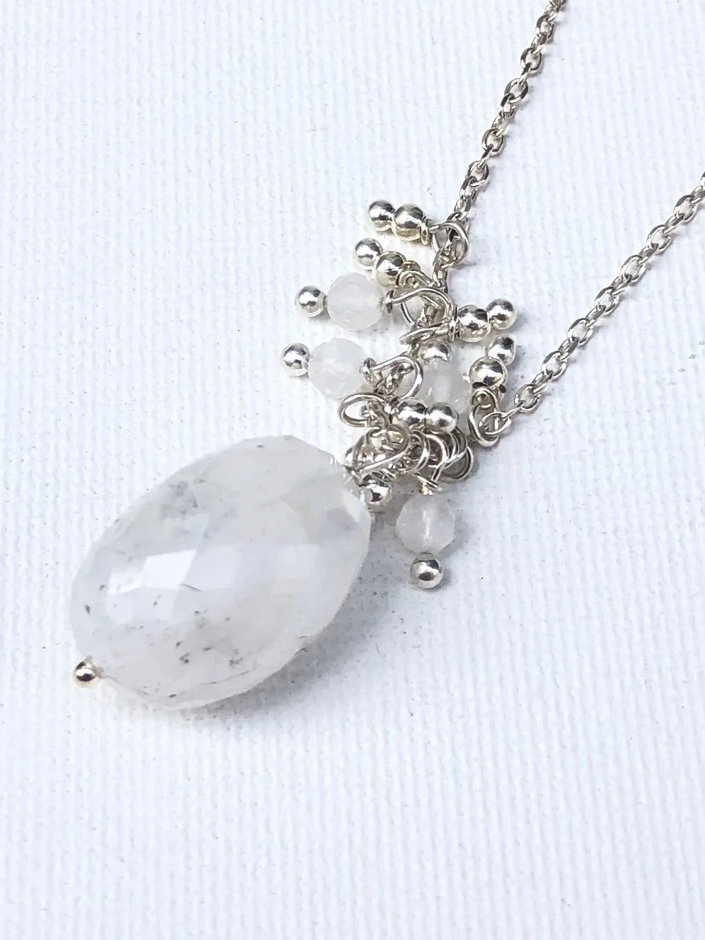 Collier avec une belle pierre de lune et 4 petites pierres de lune ainsi que 4 perles en argent 925, sur une chaîne en argent 925. La pierre de lune mesure 16 mm et la chaîne 42 mm.